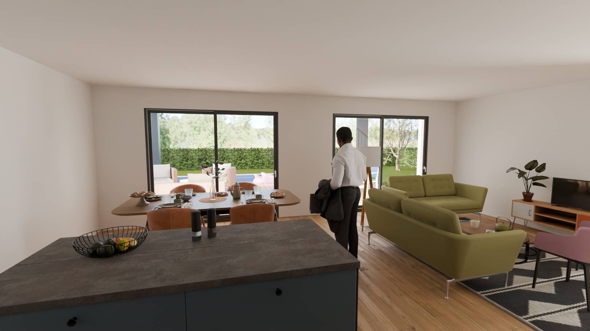 Le projet est personnalisable selon vos envies : grandes ouvertures lumineuses, carrelage 60x60 (ou autres formats au choix), volets roulants électriques, distribution des pièces modifiable…