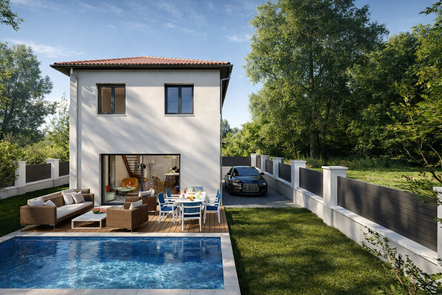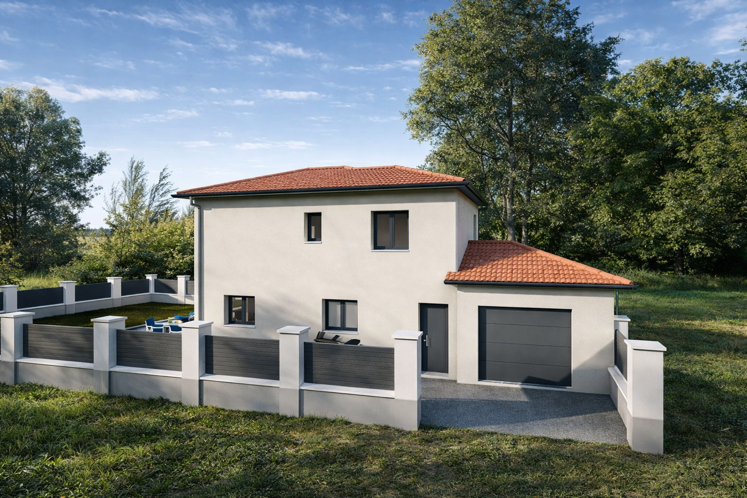 Découvrez un terrain plat et viabilisé avec maison neuve exposée sud ouest. Cadre verdoyant et calme !