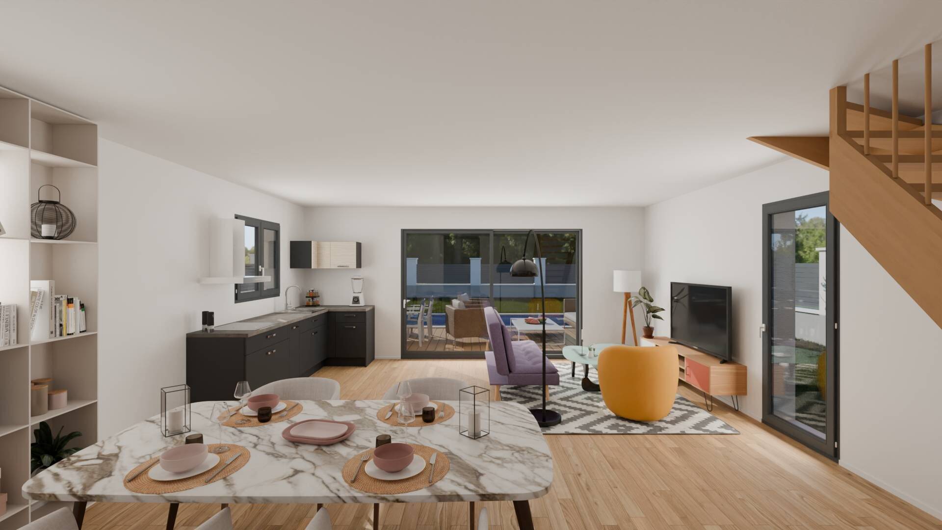 Le projet est personnalisable selon vos envies : grandes ouvertures lumineuses, carrelage 60x60 (ou autres formats au choix), volets roulants électriques, distribution des pièces modifiable…