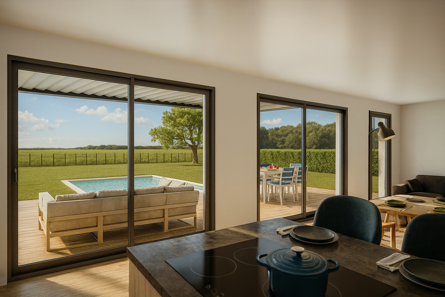 Le projet est entièrement personnalisable selon vos envies : grandes ouvertures lumineuses, carrelage 60x60 (ou autres formats), volets roulants électriques, distribution intérieure modulable…