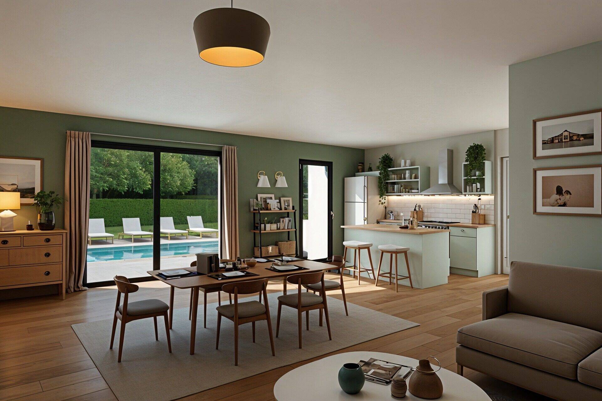 Une pièce de vie tout ouverte avec de grandes ouvertures de 45m² pour que toute la famille se retrouve.