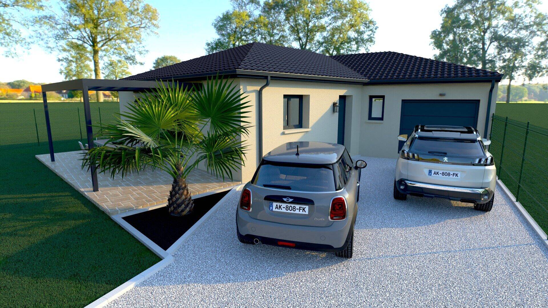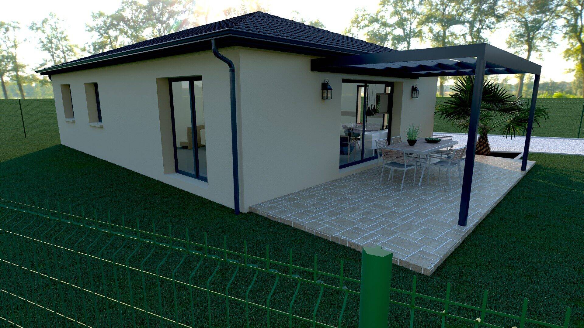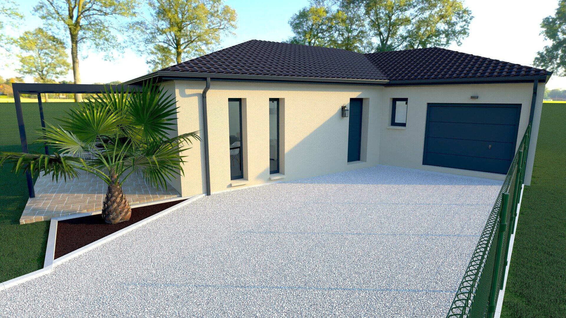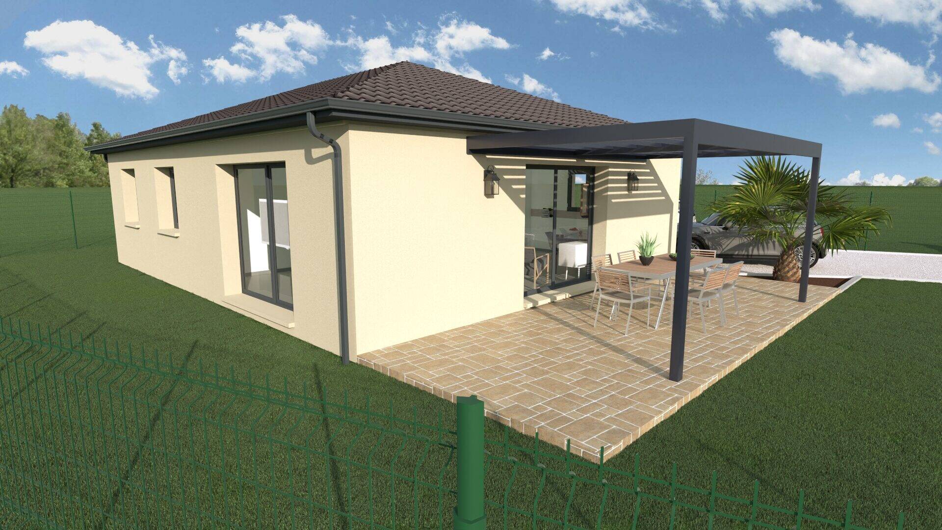 La maison de plain-pied d'une surface habitable de 94 m², se compose d'une pièce de vie ouverte de 46 m², de 3 chambres, une salle de bain avec douche à l'italienne, un WC indépendant, et d'un garage de 20 m2.